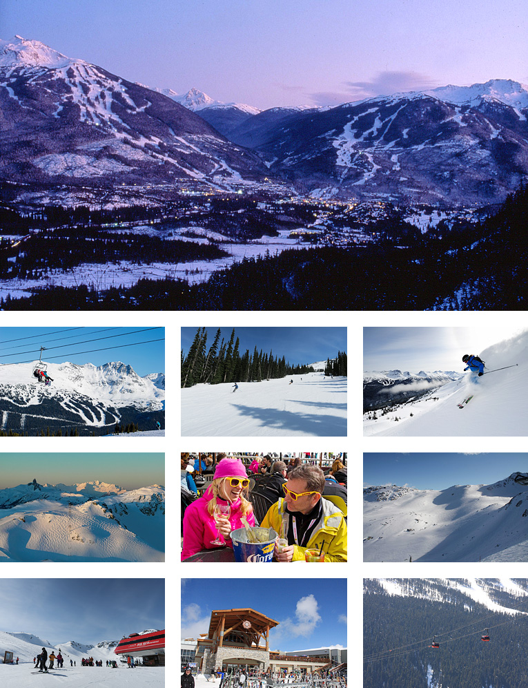 スキー場はウィスラー山、ブラッコム山の対峙する二つの山に合わせて200本以上のコースと氷河エリア、ボウルエリアで構成。スキー場からアクセスできるバックカントリーエリアも有する。